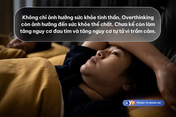 Không chỉ ảnh hưởng sức khỏe tinh thần, Overthinking còn ảnh hưởng đến sức khỏe thể chất như: Mệt mỏi, khó ngủ, đau dạ dày, nhức đầu, giảm khả năng tập trung, thay đổi khẩu vị… Chưa kể còn làm tăng nguy cơ đau tim và tăng nguy cơ tự tử vì trầm cảm.