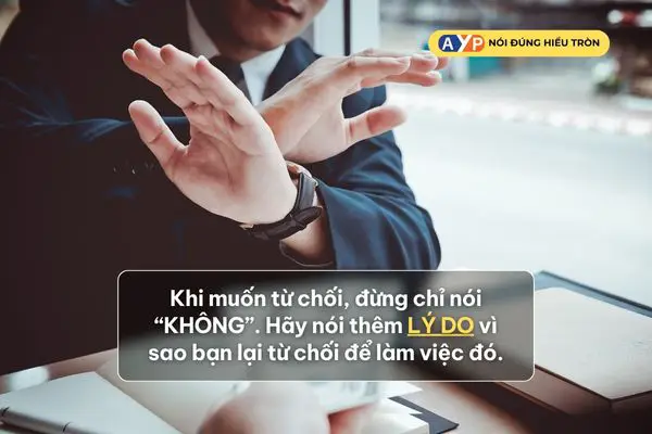 Cách từ chối khéo ở đây là đừng chỉ đưa ra câu trả lời “KHÔNG”. Hãy nói luôn cả lý do vì sao bạn chưa làm được chuyện đó. Khi đưa ra lý do chính đáng, người đối diện sẽ dễ dàng thông cảm và chấp nhận hơn.