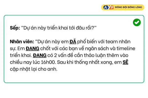 2. Trình bày ngắn gọn, đi thẳng vào vấn đề: Nêu trọng tâm, tránh nói chuyện lan man, dài dòng. Sử dụng công thức "ĐÃ - ĐANG - SẼ" khi báo cáo công việc.