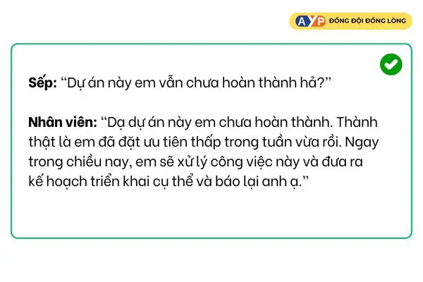 Đôi khi việc thẳng thắn thừa nhận những lỗi sai, mà không cố nói chuyện lan man lại là cách để bạn ghi điểm trong mắt Sếp và đồng nghiệp xung quanh, vì điều đó thể hiện bạn là người chân thành, thẳng thắn, và cầu tiến.