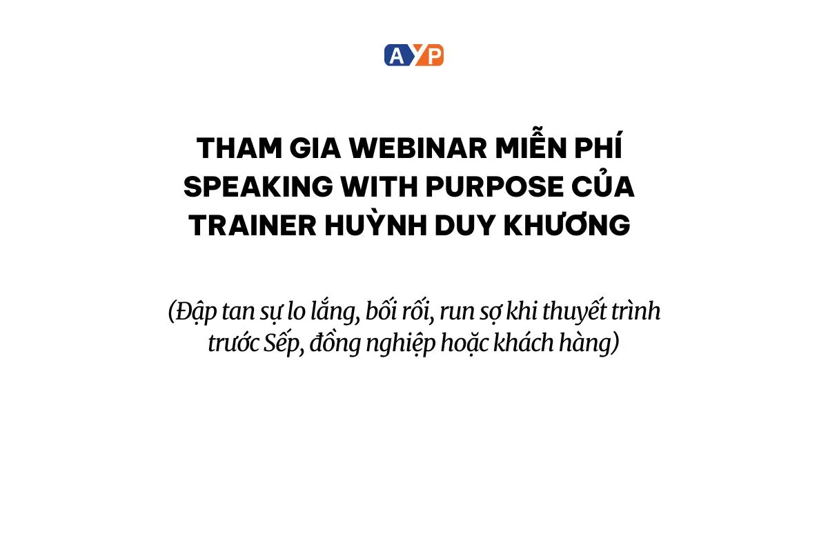 Nếu bạn muốn tìm hiểu và rèn luyện thêm kỹ năng thuyết trình, hãy tham gia Webinar miễn phí Speaking With Purpose về kỹ năng thuyết trình của Huỳnh Duy Khương để nâng cao khả năng của mình tại đây.
