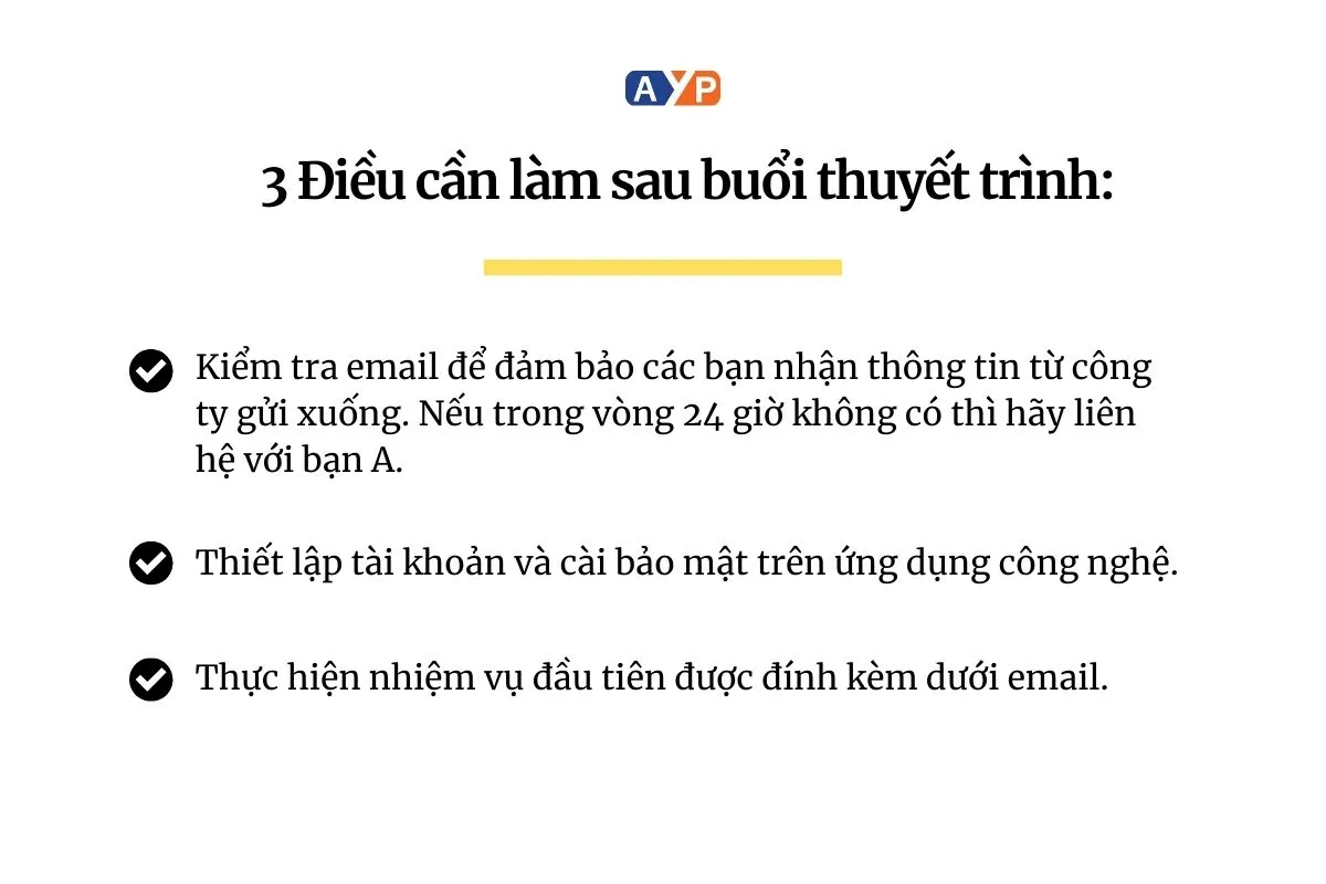 “Sau ngày hôm nay, có 3 thứ cần phải làm: (1) Kiểm tra email để đảm bảo các bạn nhận thông tin từ công ty gửi xuống. Nếu trong vòng 24 giờ không có thì hãy liên hệ với bạn A. (2) Thiết lập tài khoản và cài bảo mật trên ứng dụng công nghệ. (3)Thực hiện nhiệm nhiệm vụ đầu tiên được đính kèm dưới email”