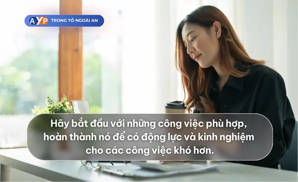 Một số người luôn thích chọn những công việc khó khăn để thể hiện bản thân. Tuy nhiên, công việc dạng này đòi hỏi bạn phải tốn nhiều thời gian và công sức thì mới có thể hoàn thành. Nếu không có đủ quyết tâm, lâu dần sẽ khiến bạn có tâm lý bị ảnh hưởng. Do đó, hãy bắt đầu với những công việc phù hợp, hoàn thành nó để có động lực và kinh nghiệm cho các công việc khó hơn.