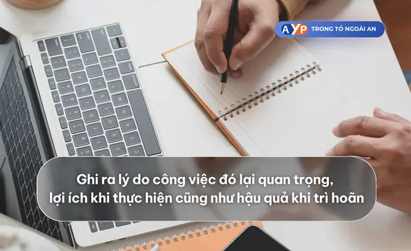 Nhận định được rõ ràng ý nghĩa của công việc mà bạn đang thực hiện sẽ giúp bạn khắc phục sự trì hoãn. Ghi ra lý do công việc đó lại quan trọng, lợi ích khi thực hiện cũng như hậu quả khi trì hoãn. Làm như vậy sẽ giúp bạn luôn gắn bó hơn với công việc và hạn chế được việc trì hoãn hơn.