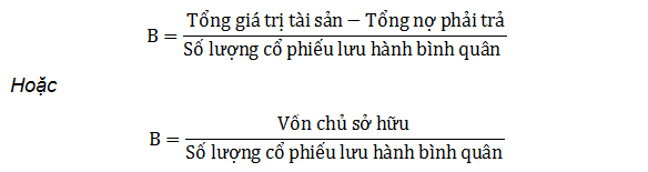 Giá trị sổ sách trên mỗi cổ phiếu = (Tổng tài sản - Tài sản vô hình - Nợ phải trả) / Số cổ phiếu đang lưu hành.
