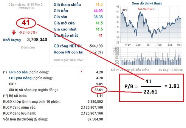 Nhìn chung, công thức và các bước tính chỉ số P/B ở cách này vẫn giống như cách đầu tiên. Tuy nhiên, bạn sẽ lấy các dữ liệu trên những website tài chính như cafef, fireant, vietstock,... Ví dụ, P/B của HPG được tính toán như hình minh họa.