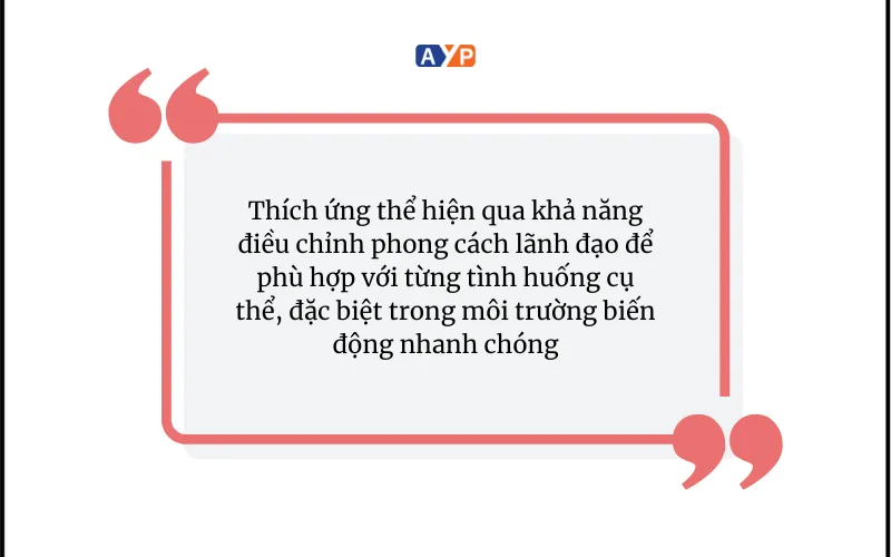 Thích ứng là một kỹ năng lãnh đạo quan trọng, thể hiện qua khả năng điều chỉnh phong cách lãnh đạo để phù hợp với từng tình huống cụ thể, đặc biệt trong môi trường biến động nhanh chóng. Khả năng này giúp tổ chức tồn tại và phát triển bền vững. Để làm được điều này, quản lý cần luôn sẵn sàng học hỏi, linh hoạt trong cách tiếp cận và nhanh chóng đưa ra quyết định phù hợp với sự thay đổi của thị trường, từ đó duy trì sự ổn định và thúc đẩy tăng trưởng trong thời đại số.