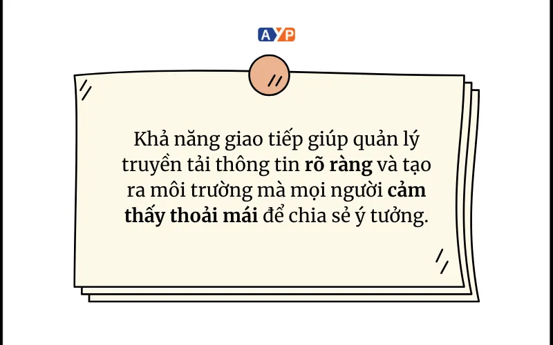 Giao tiếp hiệu quả là yếu tố quan trọng trong kỹ năng lãnh đạo. Khả năng này giúp quản lý truyền tải thông tin rõ ràng và tạo ra môi trường mà mọi người cảm thấy thoải mái để chia sẻ ý tưởng. Khi quản lý có kỹ năng giao tiếp tốt, họ có thể truyền cảm hứng, xây dựng niềm tin, từ đó tăng năng suất và hiệu quả làm việc. Để làm được điều này, quản lý cần lắng nghe tích cực, truyền đạt thông điệp mạch lạc và khuyến khích mọi người tham gia đóng góp.
