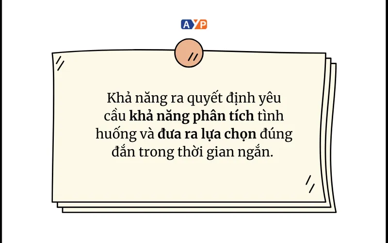 Ra quyết định là kỹ năng thiết yếu trong lãnh đạo. Nó yêu cầu khả năng phân tích tình huống và đưa ra lựa chọn đúng đắn trong thời gian ngắn. Khi đưa ra quyết định kịp thời, quản lý có thể duy trì tiến độ công việc, tránh những rủi ro không cần thiết và đạt mục tiêu nhanh hơn. Để thực hiện điều này, quản lý cần cân nhắc các lựa chọn, đánh giá rủi ro và hành động dứt khoát để dẫn dắt đội nhóm một cách hiệu quả.