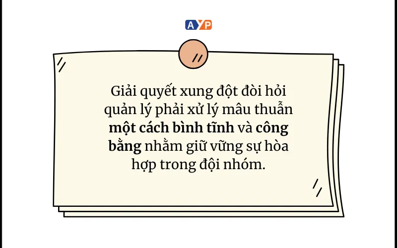 Giải quyết xung đột đòi hỏi quản lý phải xử lý mâu thuẫn một cách bình tĩnh và công bằng nhằm giữ vững sự hòa hợp trong đội nhóm. Khi các xung đột được giải quyết khéo léo, không chỉ môi trường làm việc trở nên tích cực hơn mà các thành viên trong nhóm cũng cảm thấy an tâm hơn, từ đó hiệu suất công việc được nâng cao. Quản lý cần thể hiện khả năng lắng nghe, đánh giá tình huống khách quan và đưa ra giải pháp để đạt được sự đồng thuận và thấu hiểu giữa các bên.