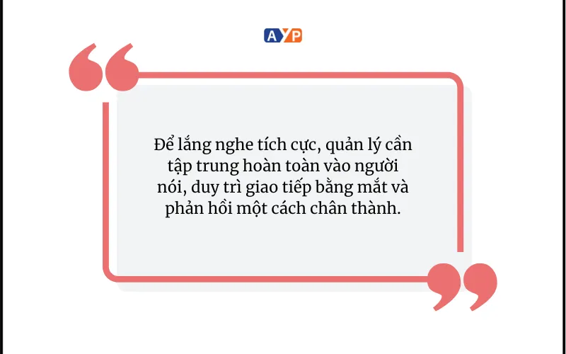 Để lắng nghe tích cực, quản lý cần tập trung hoàn toàn vào người nói, duy trì giao tiếp bằng mắt và phản hồi một cách chân thành. Việc đặt câu hỏi để làm rõ ý kiến và thể hiện sự đồng cảm cũng giúp thể hiện sự quan tâm thực sự. Quản lý nên tránh bị phân tâm và không ngắt lời, tạo cơ hội để mọi người chia sẻ thoải mái. Những hành động này giúp xây dựng sự tin tưởng, tăng cường sự gắn kết và ra quyết định một cách chính xác hơn.