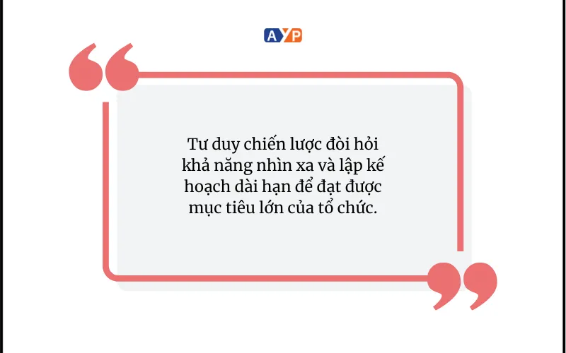 Tư duy chiến lược là yếu tố cần thiết trong kỹ năng lãnh đạo, đòi hỏi khả năng nhìn xa và lập kế hoạch dài hạn để đạt được mục tiêu lớn của tổ chức. Kỹ năng này giúp quản lý định hướng rõ ràng và giữ cho tổ chức luôn đi đúng lộ trình. Để thực hiện điều này, quản lý cần phân tích xu hướng thị trường, đánh giá các rủi ro tiềm ẩn và điều chỉnh kế hoạch kịp thời để thích ứng với những thay đổi lớn, đảm bảo sự phát triển bền vững.