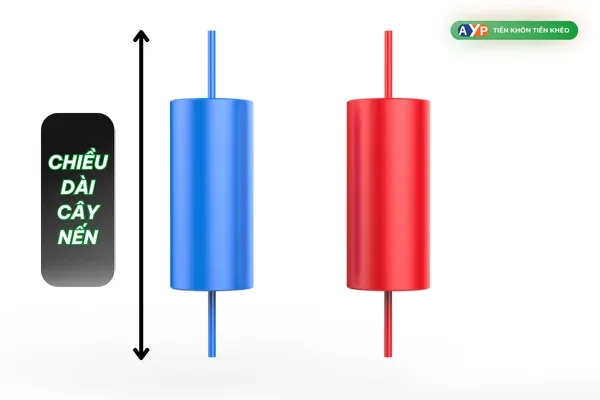 Chiều dài của nến được đo từ điểm thấp nhất đến điểm cao nhất của cây nến, bao gồm cả phần thân và bóng nến. Dựa vào độ dài của nến, ta có thể thấy rõ mức độ biến động của giá trong phiên giao dịch. Nến ngắn thường biểu thị thị trường yên ắng, trong khi nến dài cho thấy sự biến động mạnh mẽ.