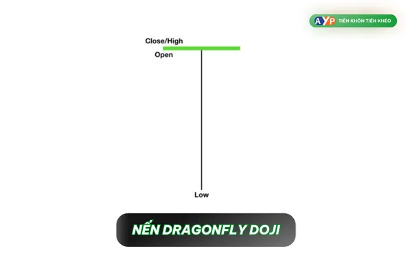 Ý nghĩa: Nến hình chuồn chuồn cho thấy thị trường đang trong trạng thái tĩnh lặng, với giá mở cửa, giá đóng cửa và giá cao nhất hầu như không thay đổi. Bóng nến dài phía dưới biểu thị sự cố gắng của thị trường trong việc cân bằng giữa lực bán và lực mua.