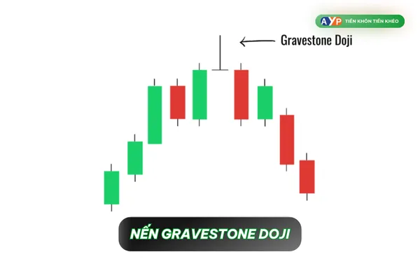 Nến có hình bia mộ - Thân nên nhỏ, bóng nến trên dài và không có râu nến dưới. Gravestone Doji chủ yếu xuất hiện ở đỉnh của xu hướng tăng giá.