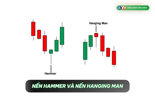 Mô tả: Nếu bóng dưới của nến dài ít nhất gấp đôi thân nến, và bóng trên ngắn hoặc không có, thì đó là dấu hiệu của mẫu nến Hammer (cây búa) hoặc Hanging Man (người treo cổ), hai mô hình này xuất hiện ở các vị trí đối lập nhau.