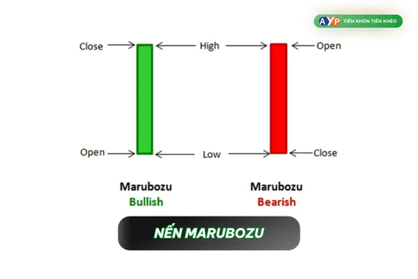 Marubozu trong tiếng Nhật có nghĩa là 'hình khối lớn' được tạo theo quy tắc nhất định. Bullish Marubozu là nến tăng (màu xanh), trong khi Bearish Marubozu là nến giảm (màu đỏ).