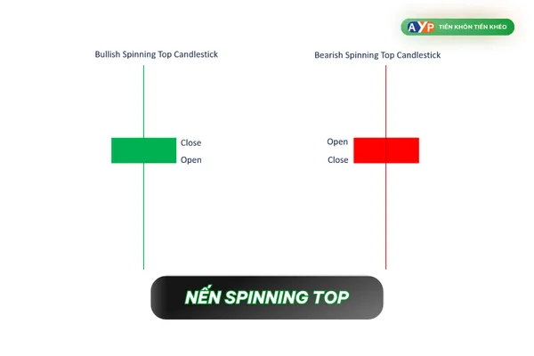 Mô tả: Phần thân của nến Spinning Tops khá nhỏ (dù không nhỏ như Doji), trong khi phần râu nến lại dài gấp nhiều lần so với thân nến.