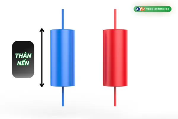 Thân nến là phần hình chữ nhật (thường có màu xanh/trắng hoặc đỏ/đen). Độ dài của thân nến phản ánh sự chênh lệch giữa giá mở cửa và giá đóng cửa. Trong biểu đồ nến Nhật, thân nến có thể hiển thị bằng màu xanh và đỏ (hoặc đôi khi là trắng và đen).