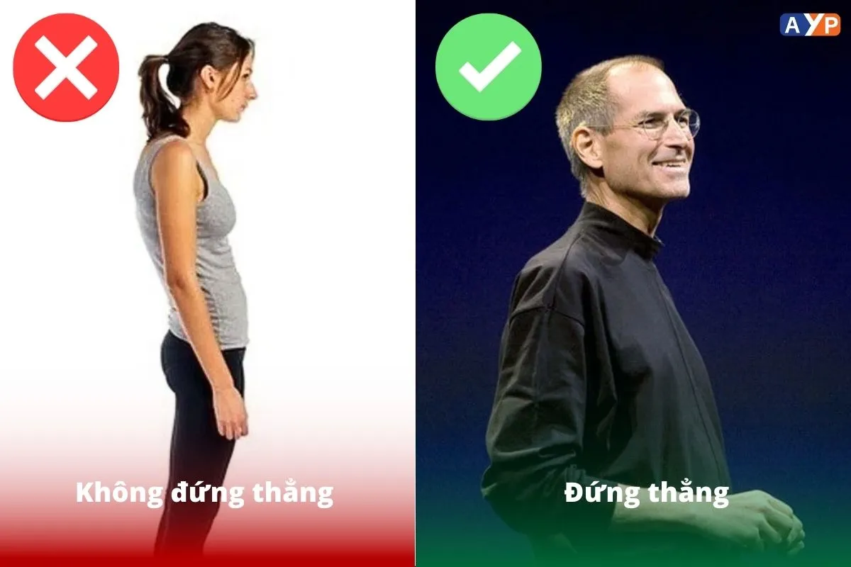 Steve Jobs là ví dụ điển hình khi ông luôn giữ tư thế thẳng lưng, tạo sự tự tin và chuyên nghiệp. Nếu cúi gù lưng, thông điệp và ấn tượng của ông có thể đã kém thuyết phục hơn.