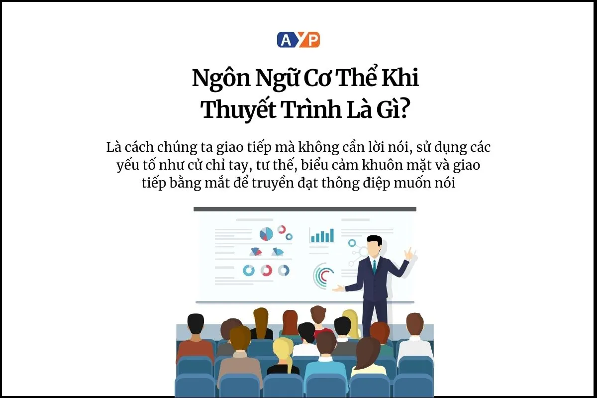 Ngôn ngữ cơ thể là cách chúng ta giao tiếp mà không cần lời nói, sử dụng các yếu tố như cử chỉ tay, tư thế, biểu cảm khuôn mặt và giao tiếp bằng mắt để truyền đạt thông điệp muốn nói. Ngôn ngữ cơ thể khi thuyết trình đóng vai trò quan trọng giúp người thuyết trình làm rõ thông điệp, tạo cảm xúc và tăng tính thuyết phục.