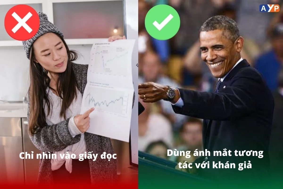 Khi duy trì ánh mắt với khán giả, bạn không chỉ thể hiện sự tự tin mà còn khơi dậy sự chú ý và tạo cảm giác kết nối cá nhân. Điều này khiến họ cảm thấy gắn bó với thông điệp của bạn hơn, từ đó làm tăng tính thuyết phục và giúp bạn kiểm soát tốt không gian thuyết trình.