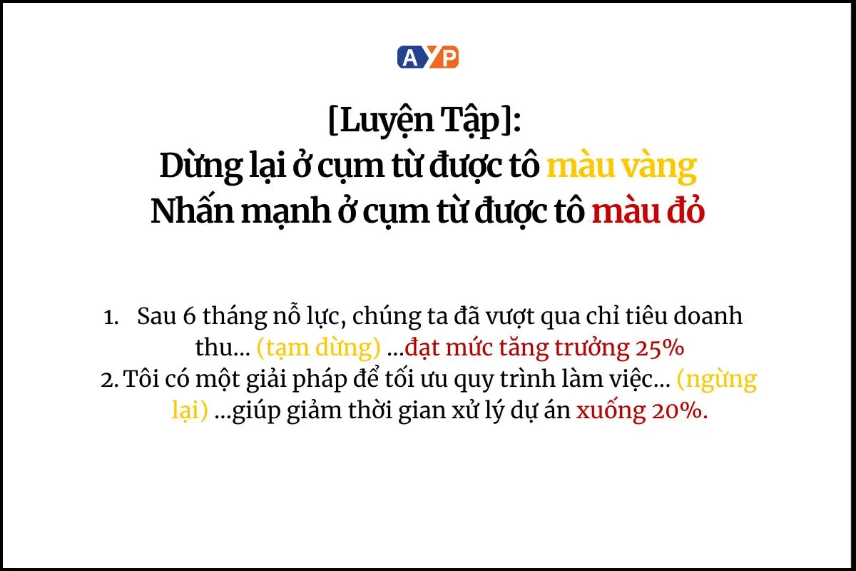 Khi đề cập đến kết quả tài chính quý vừa qua, bạn có thể nói: "Chúng ta đã đạt được lợi nhuận tăng trưởng 20%..." (tạm dừng một chút để người nghe tiếp nhận) "...một con số vượt xa mục tiêu đã đề ra." Khoảng nghỉ sau khi nói về con số tăng trưởng sẽ giúp thông tin trở nên ấn tượng và dễ ghi nhớ hơn.