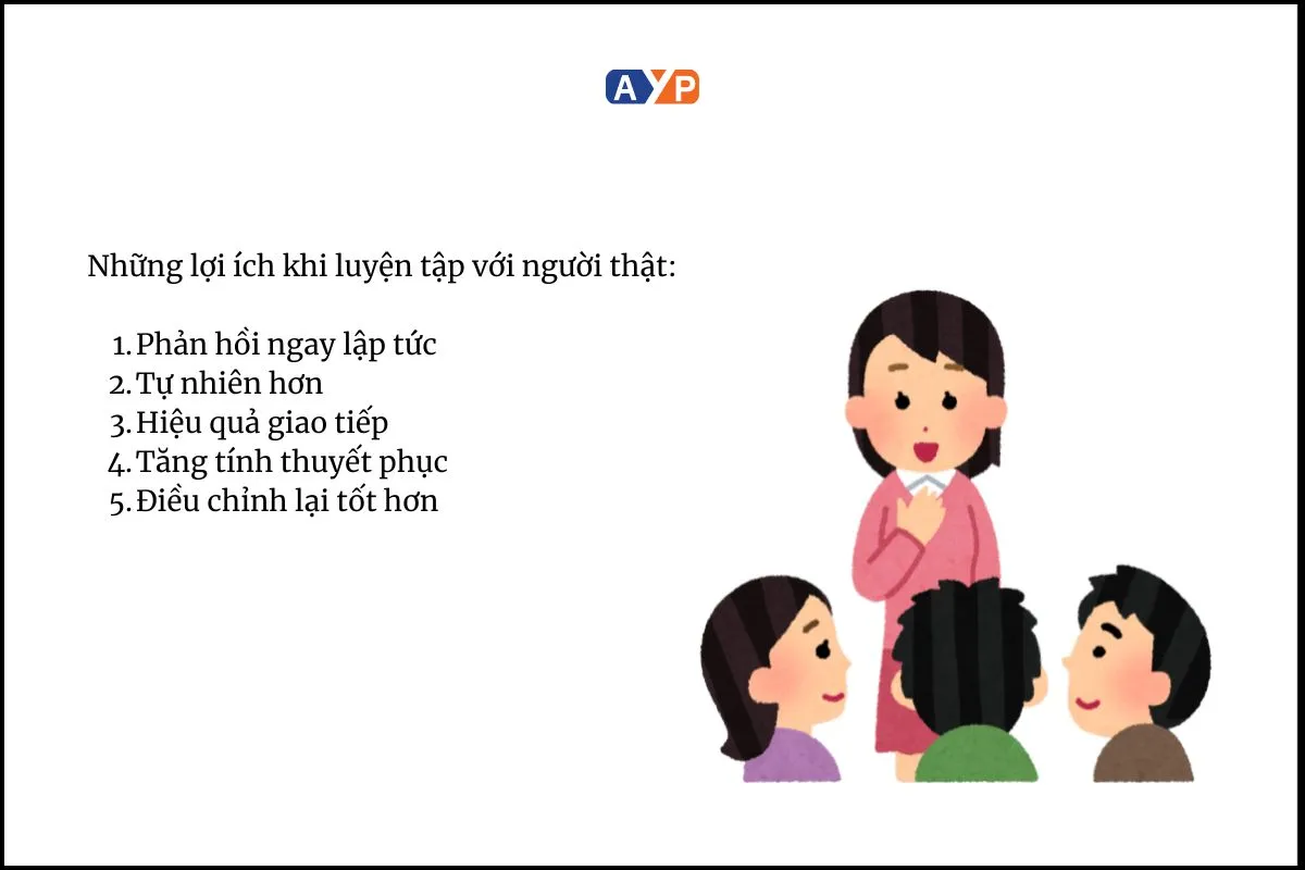 Ví dụ: Bạn có thể mời một vài người bạn nghe thử bài thuyết trình của mình và đưa ra nhận xét. Họ có thể giúp bạn nhận ra những phần cần điều chỉnh, chẳng hạn như bạn nên nói chậm lại ở đâu hoặc cần nhấn mạnh điểm nào.