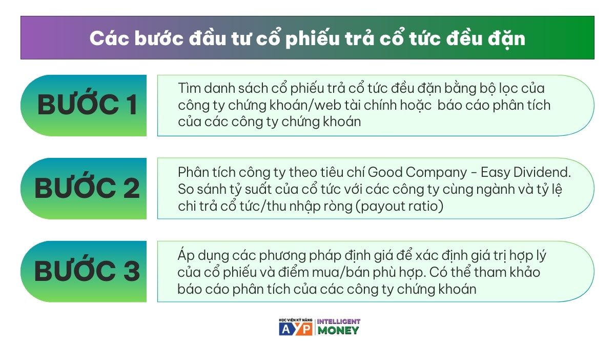Đầu tư vào các công ty trả cổ tức đều đặn bằng tiền mặt là một chiến lược khá phổ biến đối với các nhà đầu tư giá trị, đặc biệt đối với những nhà đầu tư tìm kiếm sự ổn định và thu nhập đều đặn giữa thị trường biến động. Chiến lược này tập trung vào việc lựa chọn những doanh nghiệp có lịch sử chia cổ tức minh bạch, khả năng tài chính vững mạnh và hoạt động ổn định qua các chu kỳ kinh tế.