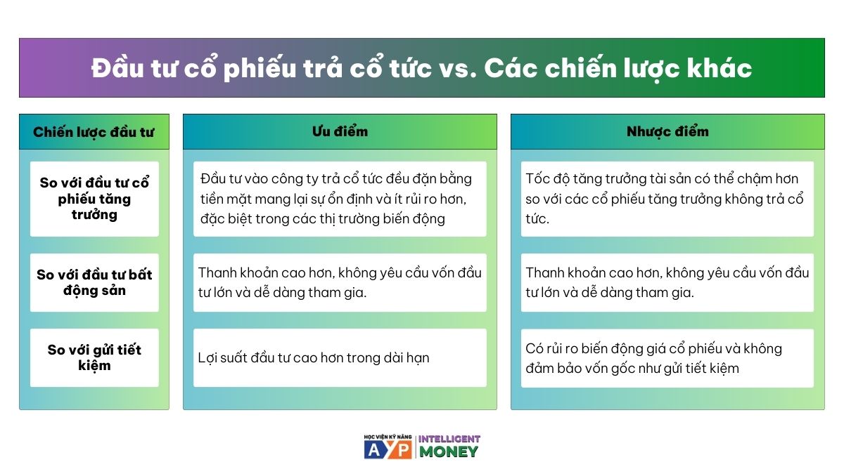 Bên dưới là ưu/nhược điểm của chiến lược đầu tư vào công ty trả cổ tức đều đặn bằng tiền mặt so với các chiến lược đầu tư khác: