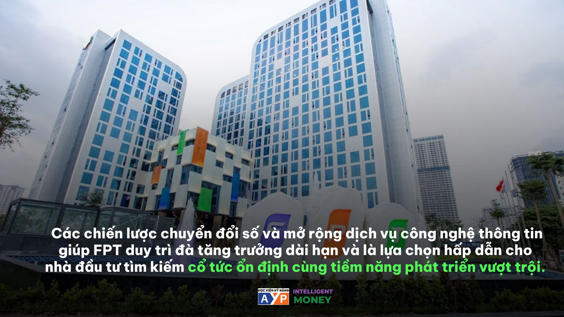 Lợi suất cổ tức hiện tại của FPT khoảng 4%/năm, với tỷ lệ chi trả cổ tức bằng tiền mặt đều đặn nhờ dòng tiền hoạt động mạnh mẽ và biên lợi nhuận ròng đạt trên 15%. Các chiến lược chuyển đổi số và mở rộng dịch vụ công nghệ thông tin giúp FPT duy trì đà tăng trưởng dài hạn và là lựa chọn hấp dẫn cho nhà đầu tư tìm kiếm cổ tức ổn định cùng tiềm năng phát triển vượt trội.