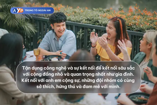 Tận dụng công nghệ và sự kết nối để quay trở về kết nối sâu sắc hơn với cộng đồng nhỏ và quan trọng nhất đối với các bạn như gia đình, đặc biệt trong trường hợp mà các bạn đang sống xa nhà. Kết nối với anh em cộng sự, những đội nhóm có cùng sở thích, hứng thú và đam mê với mình.