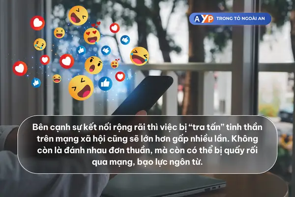 Bên cạnh sự kết nối rộng rãi thì việc bị “tra tấn” tinh thần trên mạng xã hội cũng sẽ lớn hơn gấp nhiều lần. Không còn là đánh nhau đơn thuần, chúng ta còn có thể bị quấy rối qua mạng, bạo lực ngôn từ.