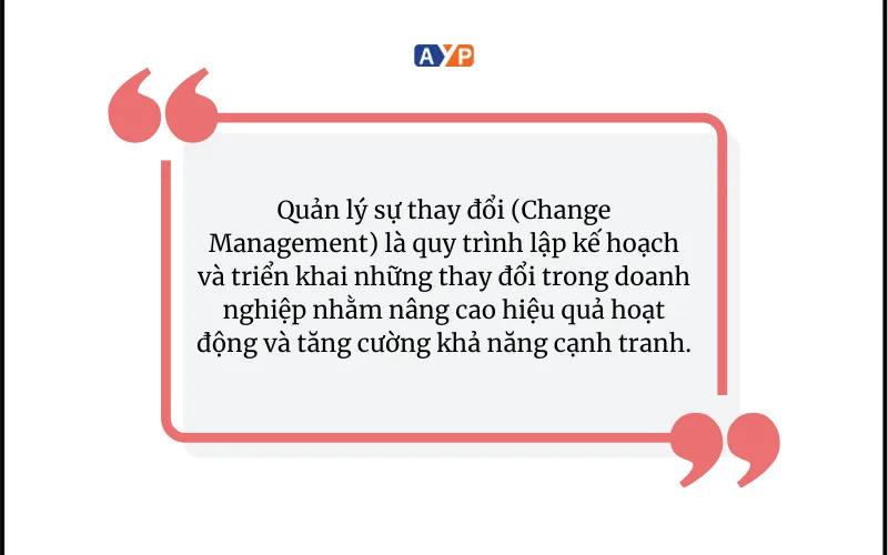 Quản lý sự thay đổi (Change Management) là quy trình giúp doanh nghiệp điều chỉnh, thích nghi với các thay đổi nhằm cải thiện hiệu quả hoạt động và nâng cao khả năng cạnh tranh. Thay đổi có thể bao gồm việc áp dụng công nghệ mới, cải tiến quy trình, hoặc tái cơ cấu bộ máy tổ chức. Quản lý sự thay đổi giúp đảm bảo quá trình này diễn ra suôn sẻ, hạn chế rủi ro và đạt được mục tiêu đề ra.