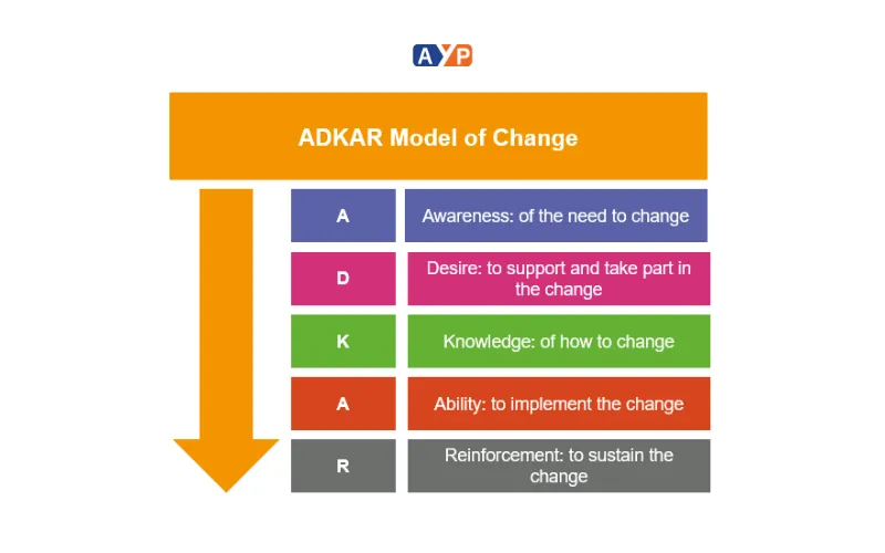 Mô hình ADKAR do Jeff Hiatt phát triển, bao gồm 5 bước:
