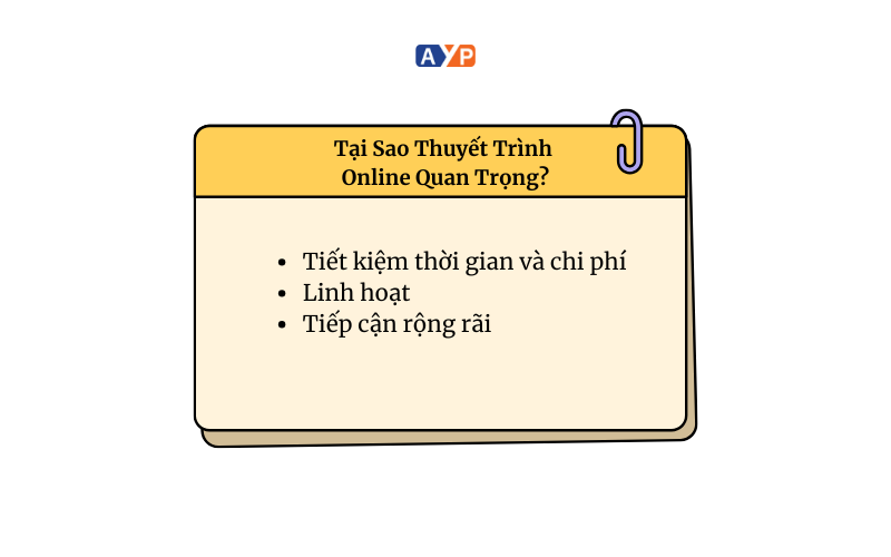 - Tại Sao Thuyết Trình Online Quan Trọng? Thuyết trình online tiết kiệm chi phí, linh hoạt về thời gian và không gian, đồng thời giúp tiếp cận khán giả rộng rãi.