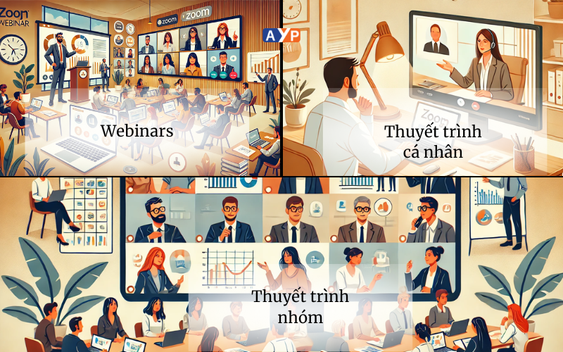- Webinars: Thuyết trình được tổ chức cho một nhóm lớn khán giả, thường được dùng trong các buổi đào tạo hoặc hội thảo.