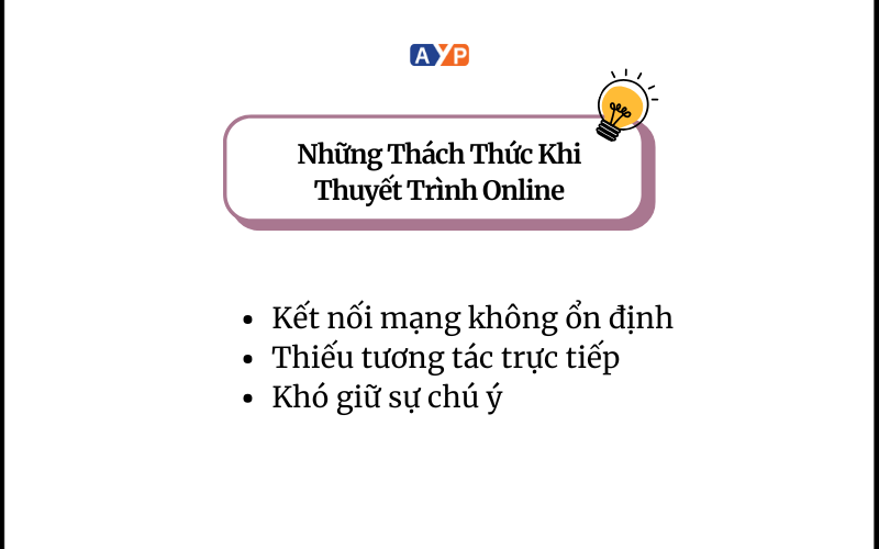 - Những Thách Thức Khi Thuyết Trình Online Các vấn đề như kết nối mạng không ổn định, thiếu tương tác trực tiếp và khó giữ sự chú ý của khán giả.